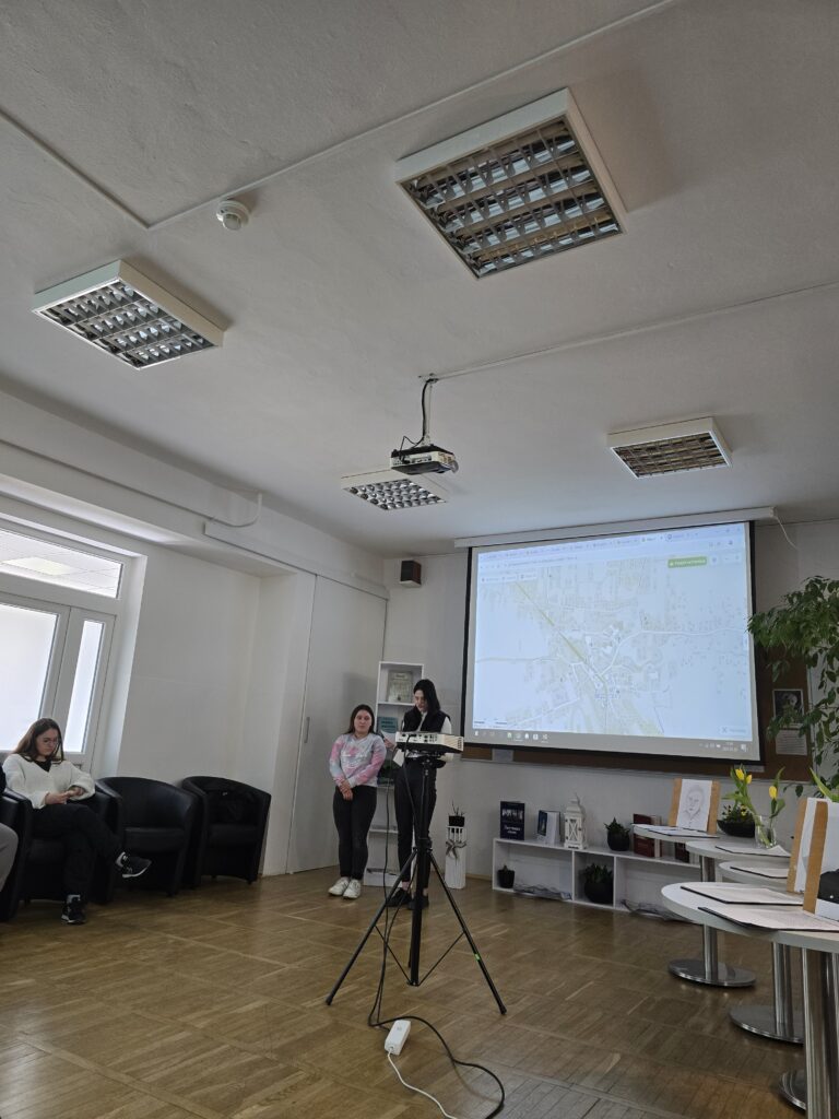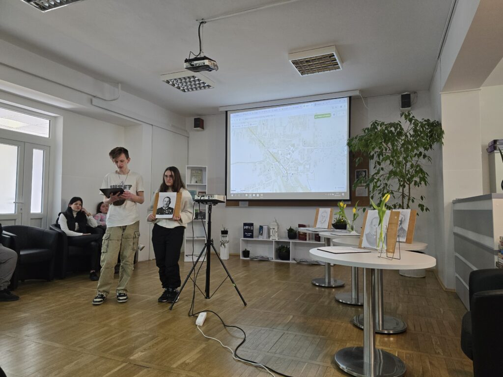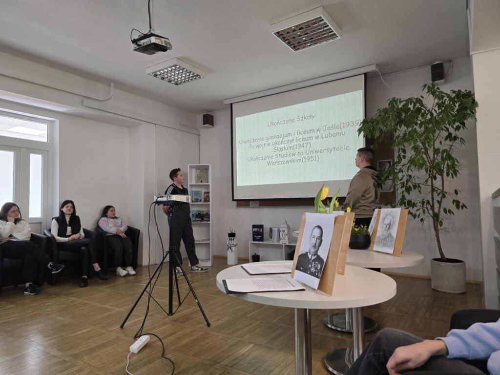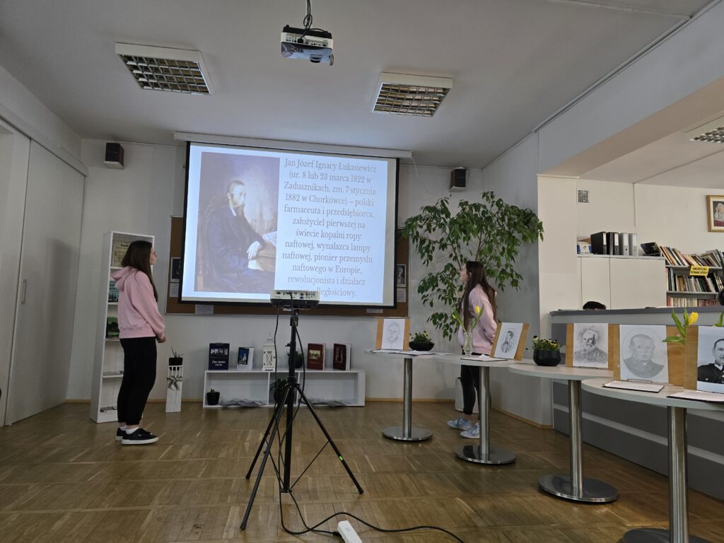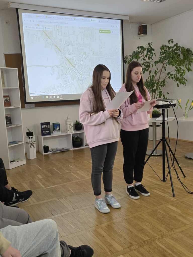 I tak 20 marca 2025r. w czytelni biblioteki szkolnej przed zgromadzoną grupą nauczycieli, koleżanek i kolegów przedstawili swoją pracę w projekcie edukacyjnym „Patroni brzosteckich ulic”