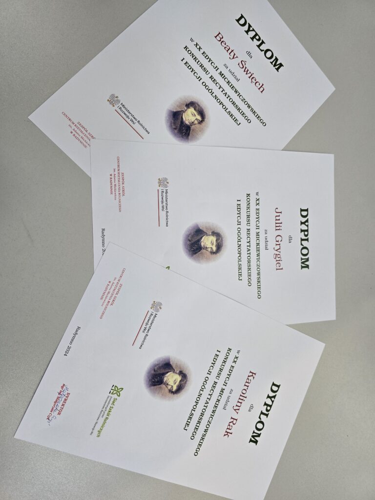 10 grudnia 2024 r. w ZS CKR im. Adama Mickiewicza w Radymnie, odbyła się XX EDYCJA MICKIEWICZOWSKIEGO KONKURSU RECYTATORSKIEGO i XIV EDYCJA KONKURSU PLASTYCZNEGO Namaluj poezję Adama Mickiewicza. Po raz pierwszy konkurs odbył się na poziomie ogólnopolskim dla młodzieży uczącej się w Sieci Szkół Rolniczych prowadzonych przez Ministra Rolnictwa i Rozwoju Wsi. Tegoroczna ogólnopolska edycja konkursu recytatorskiego stała na bardzo wysokim poziomie. Do współzawodnictwa przystąpiło kilkudziesięciu uczniów prezentując obszerne fragmenty twórczości polskiego wieszcza a wśród nich Julia Grygiel i Beata Święch uczennice technikum żywienia i gastronomii , oraz Karolina Rak uczennica technikum weterynarii , które wykazały się dojrzałą recytacją wybranych przez siebie utworów. Zaprezentowana interpretacja ballady ?Romantyczność? przez Karolinę Rak, jej wrażliwość na piękno polszczyzny, emocjonalność i skupienie na tekście ujęła komisję , która przyznała jej trzecie miejsce.