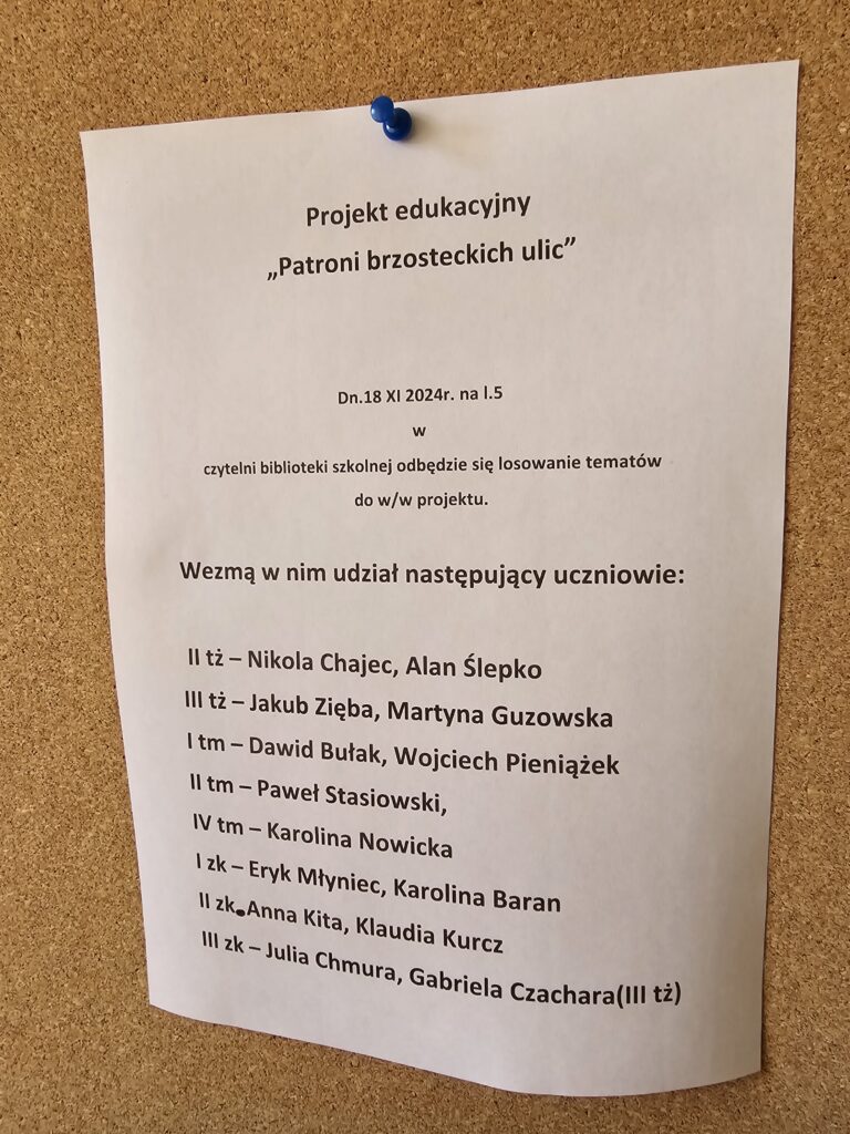 Do projektu edukacyjnego „Patroni brzosteckich ulic” zgłosiły się dwuosobowe zespoły z następujących klas: